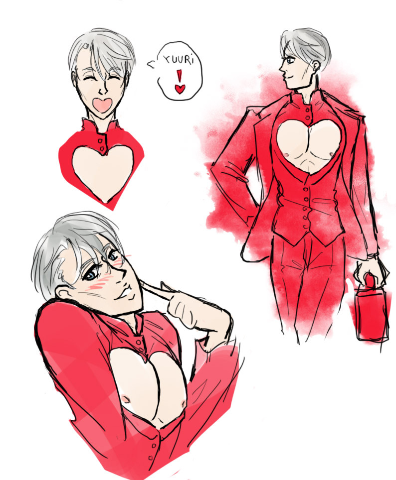 Viktor “tiddies out” Nikiforov and the glamorous heart shaped boob window suit. People say Yuuri bought it for him, and I love this idea.